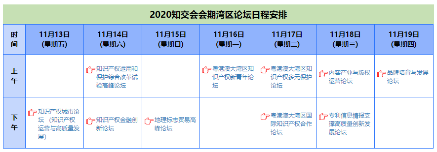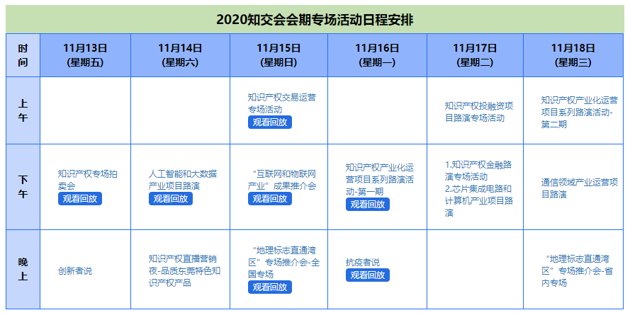 知交会期间将举行知识产权交易博览、知识产权湾区论坛及多项知识产权专场活动。在知交会网站首页“湾区论坛”和“在线专场”可查看议程及查看回放。