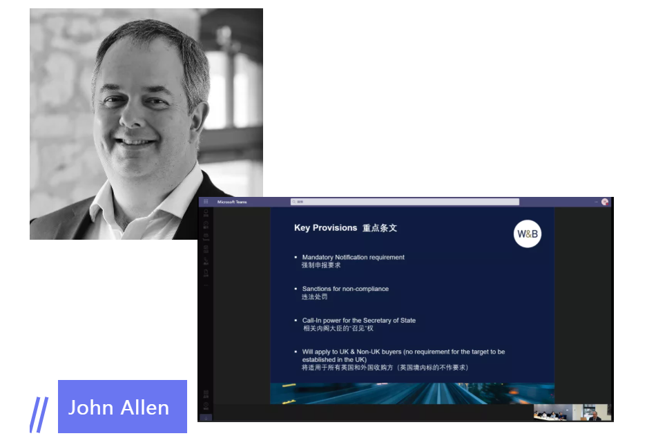 John Allen详细地介绍了英国《2021年国家安全与投资法》可能对英国投资产生的影响,他重点分析了新建立的强制申报制度、自愿申报制度、违反审查要求的法律后果、“召见”权及其产生的法律影响,外国投资者投资高端材料等重点敏感行业时,须格外注意是否可能引起英国政府部门的关注、进行申报,他特别指出,“国家安全”一词的含义是不确定的,如何准确理解“国家安全”便十分重要。