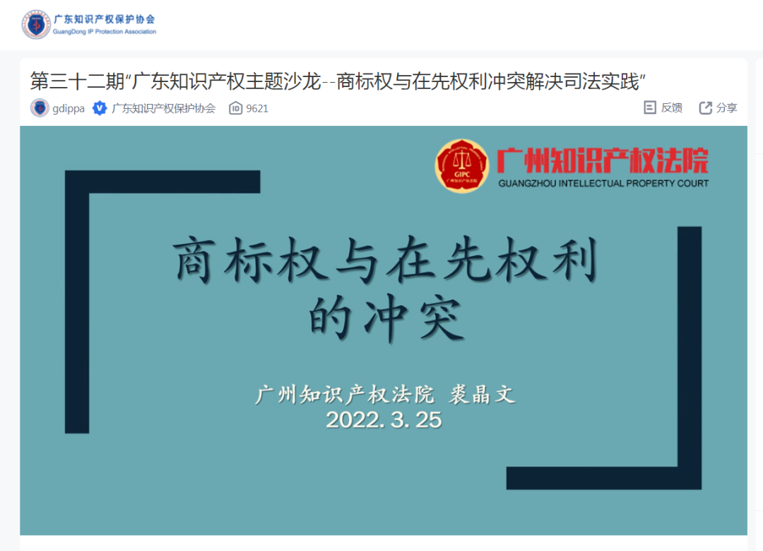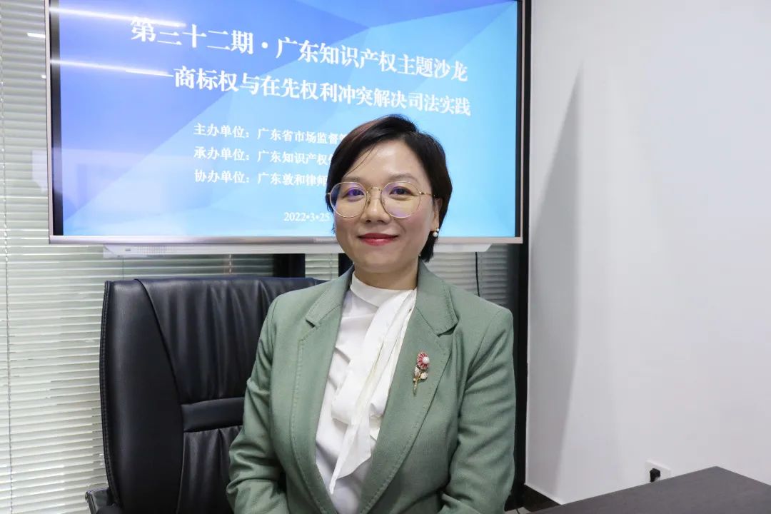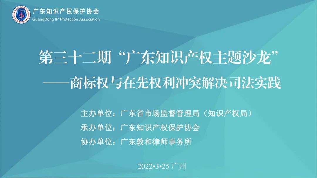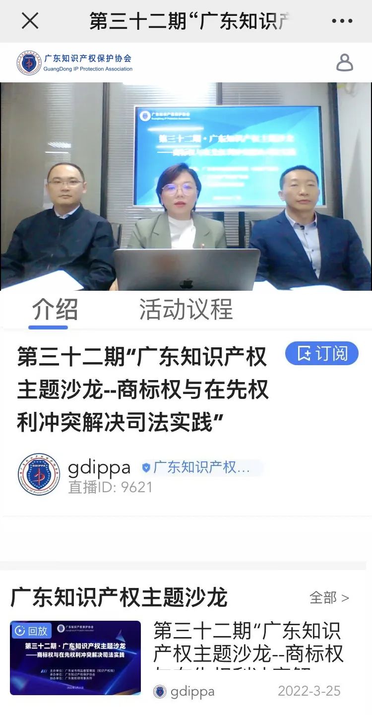 2022年3月25日下午两点半,第三十二期“广东知识产权主题沙龙”直播正式开播,直播间邀请了广州知识产权法院四级高级法官裘晶文,广东敦和律师事务所高级合伙人罗亚菲和广东格林律师事务所主任、高级合伙人杨河三位嘉宾,就“商标权与在先权利冲突解决司法实践”进行交流分享。