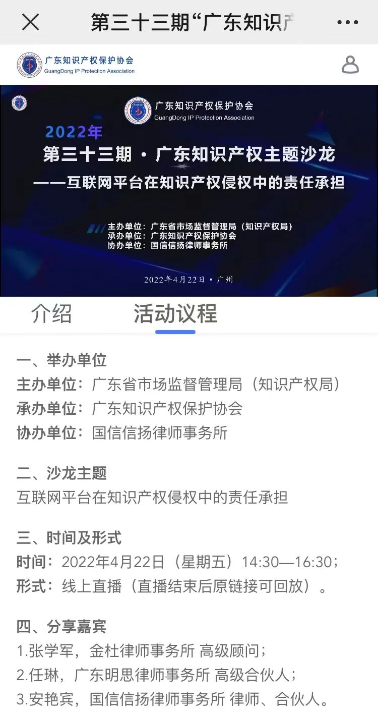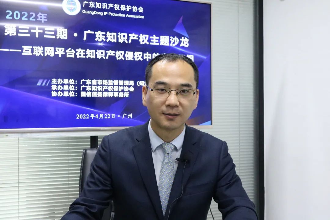 2022年4月22日下午两点半,第三十三期“广东知识产权主题沙龙”直播正式开播,直播间邀请了金杜律师事务所高级顾问张学军、广东明思律师事务所高级合伙人任琳和国信信扬律师事务所合伙人安艳宾三位嘉宾,就“互联网平台在知识产权侵权中的责任承担”进行交流分享,其中张学军顾问及任琳律师以线上会议的方式接入直播间。