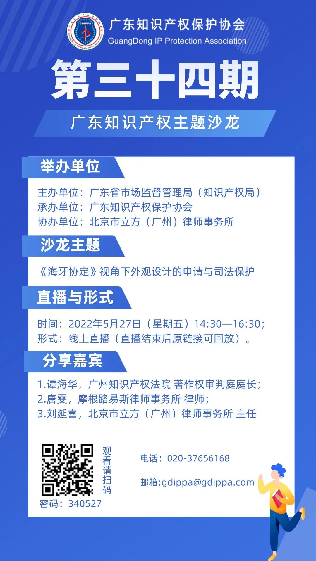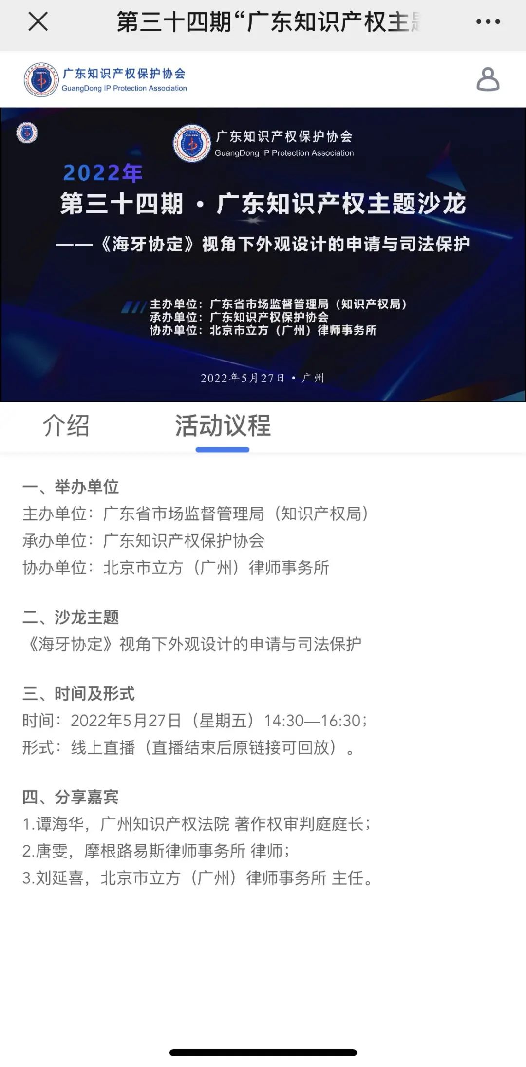 2022年5月27日下午两点半,第三十四期广东知识产权主题沙龙直播正式开播。主题沙龙邀请了北京市立方(广州)律师事务所主任刘延喜、摩根路易斯律师事务所律师唐雯和广州知识产权法院著作权审判庭庭长谭海华三位嘉宾,就“《海牙协定》视角下外观设计的申请与司法保护”进行交流分享。