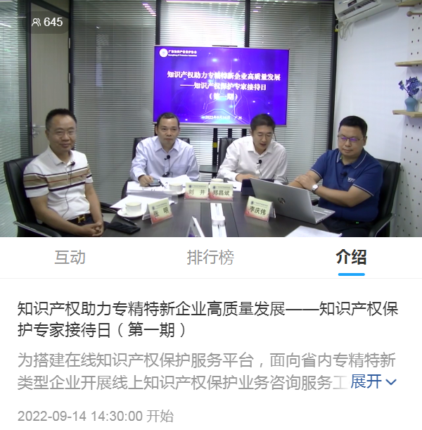 “专精特新”企业及相关单位知识产权人员超500人次观看了实时直播节目,直播平台有回放功能,目前观看达645人次。