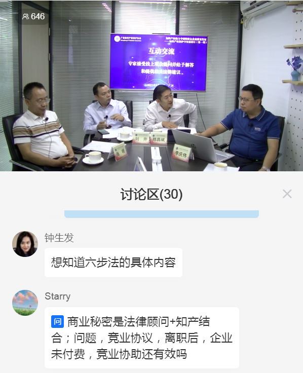 本期接待日邀请了广东品安律师事务所主任刘井、东莞市华南专利商标事务所有限公司董事长张明、广东广信君达律师事务所合伙人、专利代理师李庆伟以及广东卓建(广州)律师事务所主任郑昌斌四位专家,就承接协会“知识产权保护能力提升”项目服务企业过程中总结的经验及企业普遍存在的知识产权保护方面问题进行分享,并接受线上观众提问给予解答和提供相关法律建议。