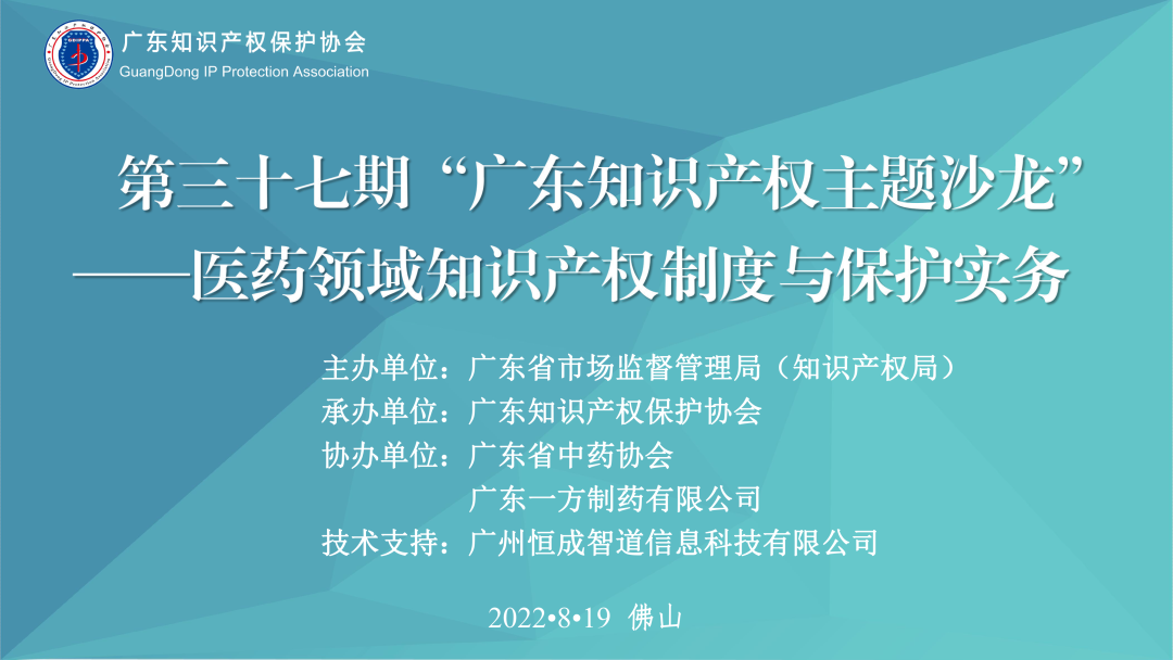 2022年8月19日下午,第三十七期“广东知识产权主题沙龙——医药领域知识产权制度与保护实务”在广东一方制药有限公司举行,广东知识产权保护协会副秘书长尚勇、广东一方制药有限公司技术副总监罗文汇、广州嘉权专利商标事务所有限公司副总经理薛建强、中国(南方)知识产权运营中心执行总裁巴特、广东众生药业股份有限公司知识产权负责人刘志强等嘉宾出席沙龙活动。