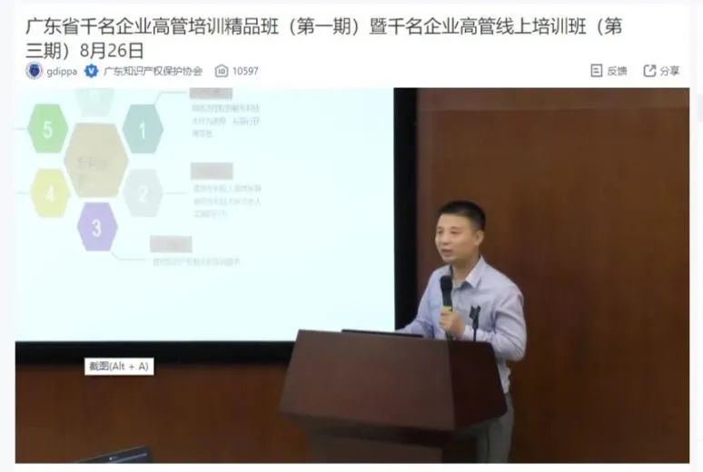 为进一步提升我省科技创新型企业知识产权高管人才业务水平,提高企业知识产权运用与保护意识,在广东省市场监督管理局(知识产权局)指导下,广东知识产权保护协会主办的广东省“千名企业高管培训精品班(第一期)暨千名企业高管线上培训班(第三期)”于2022年8月26日上午正式开班。