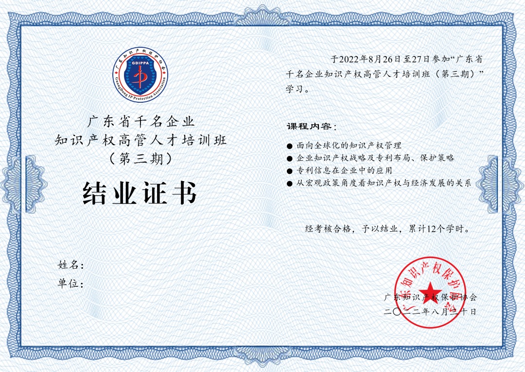 协会近期将通过邮件形式发放结业证书,并将通过考核的学员纳入广东省企业知识产权高管人才储备库,为广东省不断壮大企业知识产权高质量人才队伍提供有力支持。