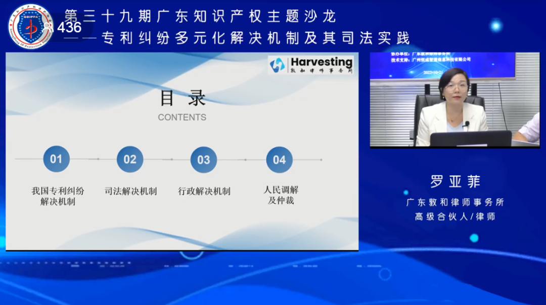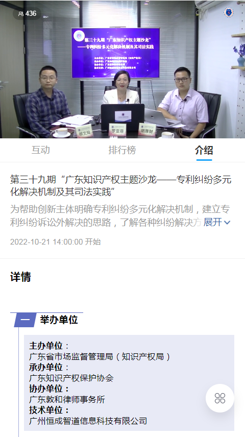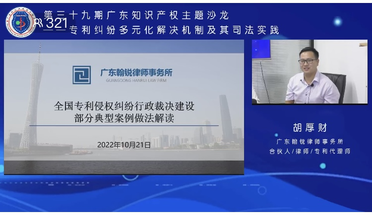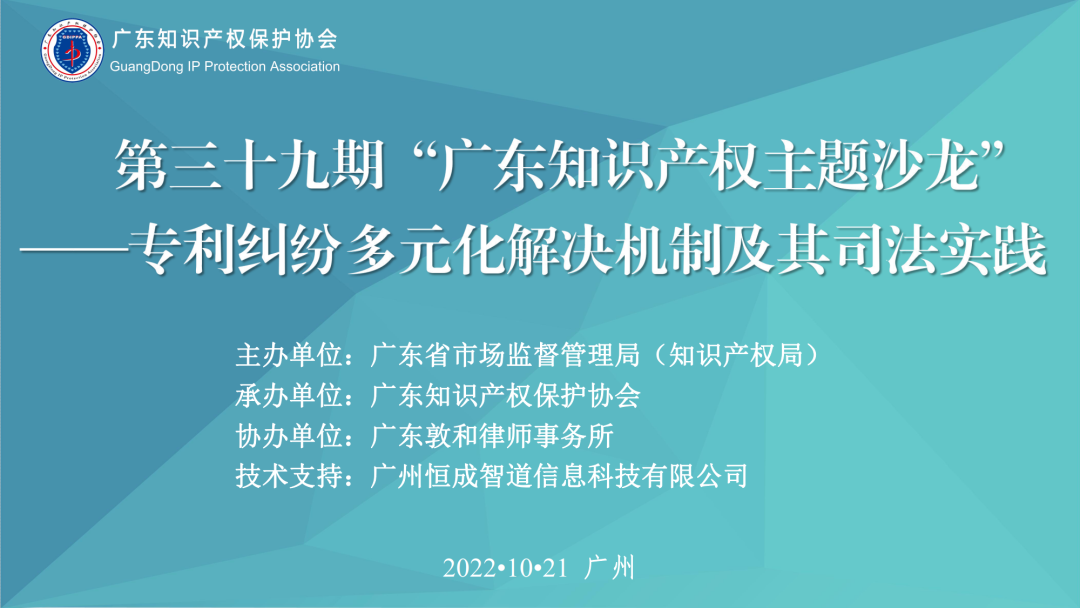10月21日下午两点半,第三十九期“广东知识产权主题沙龙”直播正式开播。直播间邀请了广东敦和律师事务所高级合伙人、律师罗亚菲,广州知识产权法院著作权审判庭二级法官助理郝文灿以及广东翰锐律师事务所合伙人、律师、专利代理师胡厚财三位嘉宾,就“专利纠纷多元化解决机制及其司法实践”主题进行交流分享。