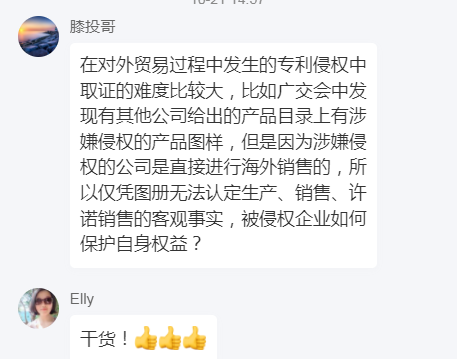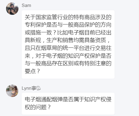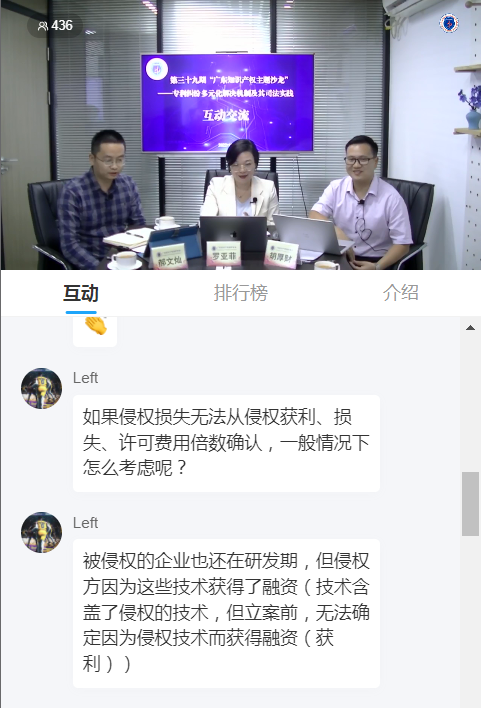 专家主题分享过后,沙龙直播进入线上互动交流环节。观看直播代表通过线上讨论区与三位专家就“侵权损失确认”“未确权的专利保护”“研发期融资”等相关问题进行讨论和交流。