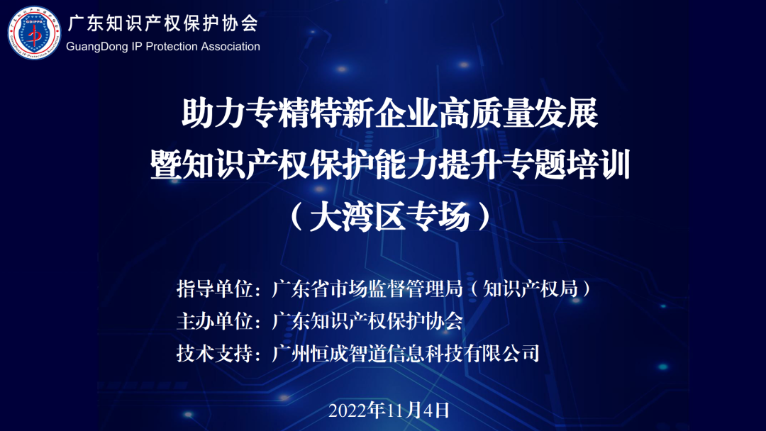 2022年11月4日下午,“助力专精特新企业高质量发展暨知识产权保护能力提升专题培训(大湾区专场)”顺利举行。