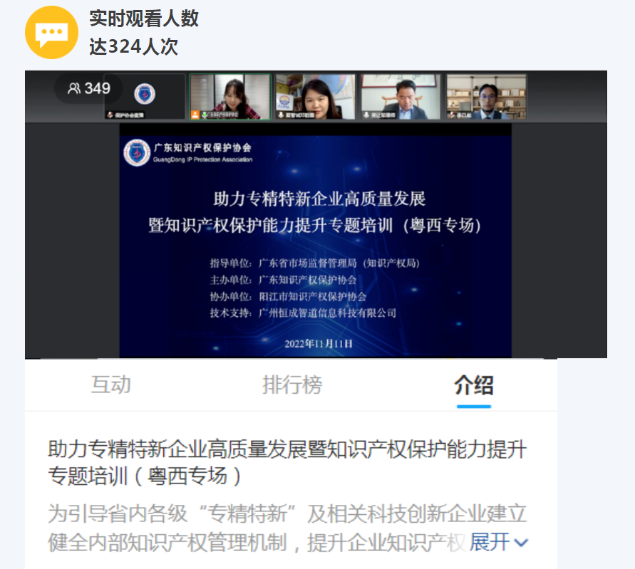粤西地区“专精特新”和科技创新企业及相关单位知识产权人员超324人次观看了实时直播节目,直播平台有回放功能,目前观看达349人次。