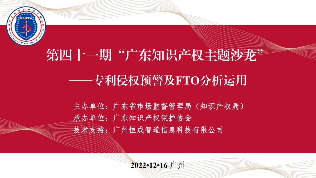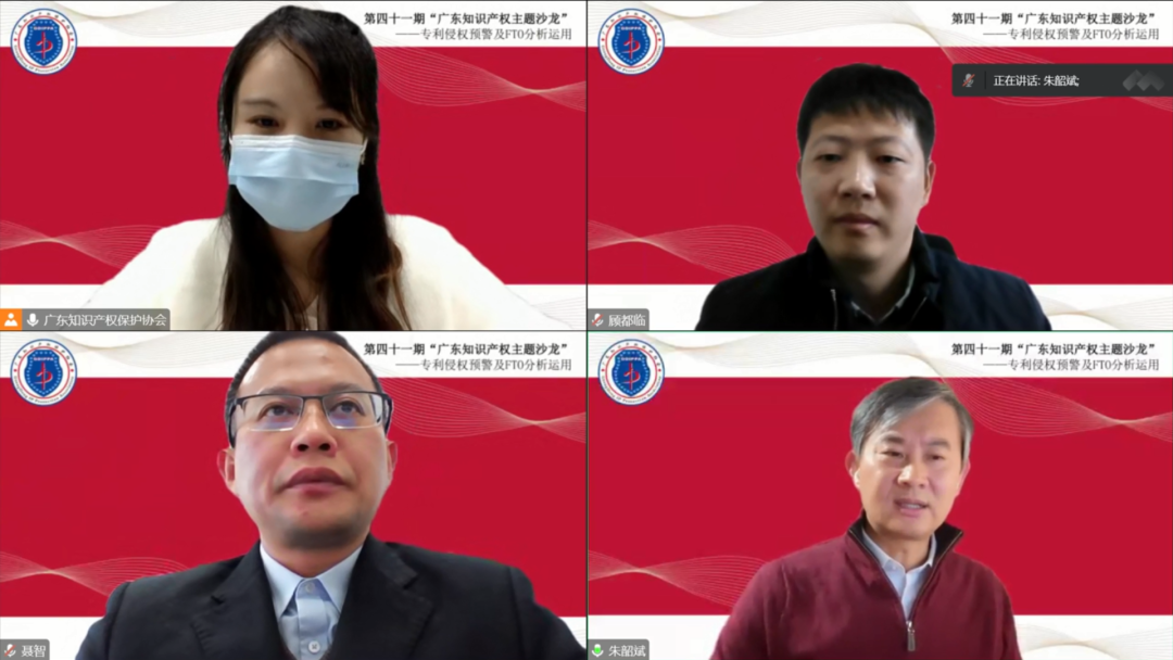 12月16日下午两点半,第四十一期“广东知识产权主题沙龙”直播正式开播。直播间邀请了摩根路易斯律师事务所合伙人朱韶斌,广州合享新创信息科技有限公司总经理顾都临,以及华进联合专利商标代理有限公司知识产权咨询事业部副总经理聂智三位嘉宾,就“专利侵权预警及FTO分析运用”主题进行交流分享。