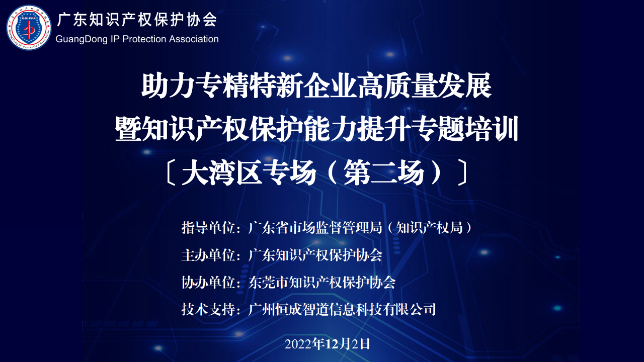 12月2日下午,“助力专精特新企业高质量发展暨知识产权保护能力提升专题培训〔大湾区专场(第二场)〕”顺利举行。