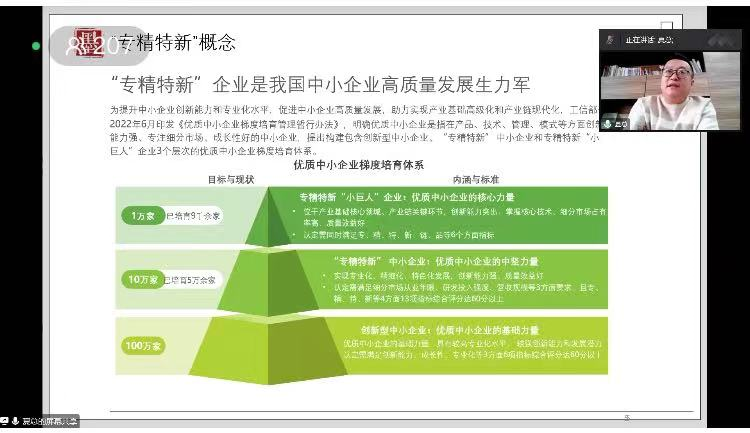 夏士军总经理从专精特新企业现状、企业创新能力的体现两个角度介绍了专精特新企业发展情况,并就如何构建知识产权优势提升企业核心竞争力以及如何构建人才队伍完善企业知识产权管理体系两个方面为企业代表提供意见及建议。