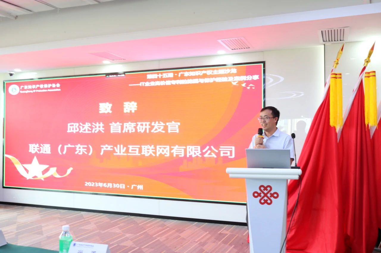 联通(广东)产业互联网有限公司首席研发官邱述洪为沙龙活动致辞,他表示很荣幸能与广东知识产权保护协会携手举办本次主题沙龙活动,对各位参会代表的到来表示热烈欢迎,希望各位能在本次沙龙活动获得新的灵感及启示。
