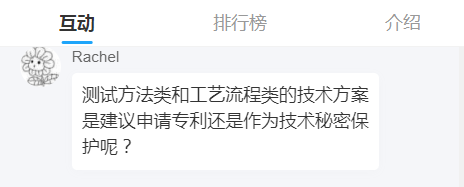 互动交流环节,观看直播代表通过线上讨论区与三位专家就“商业秘密权属”“知识产权战略”“测试方法类专利申请”等相关问题进行讨论和交流。