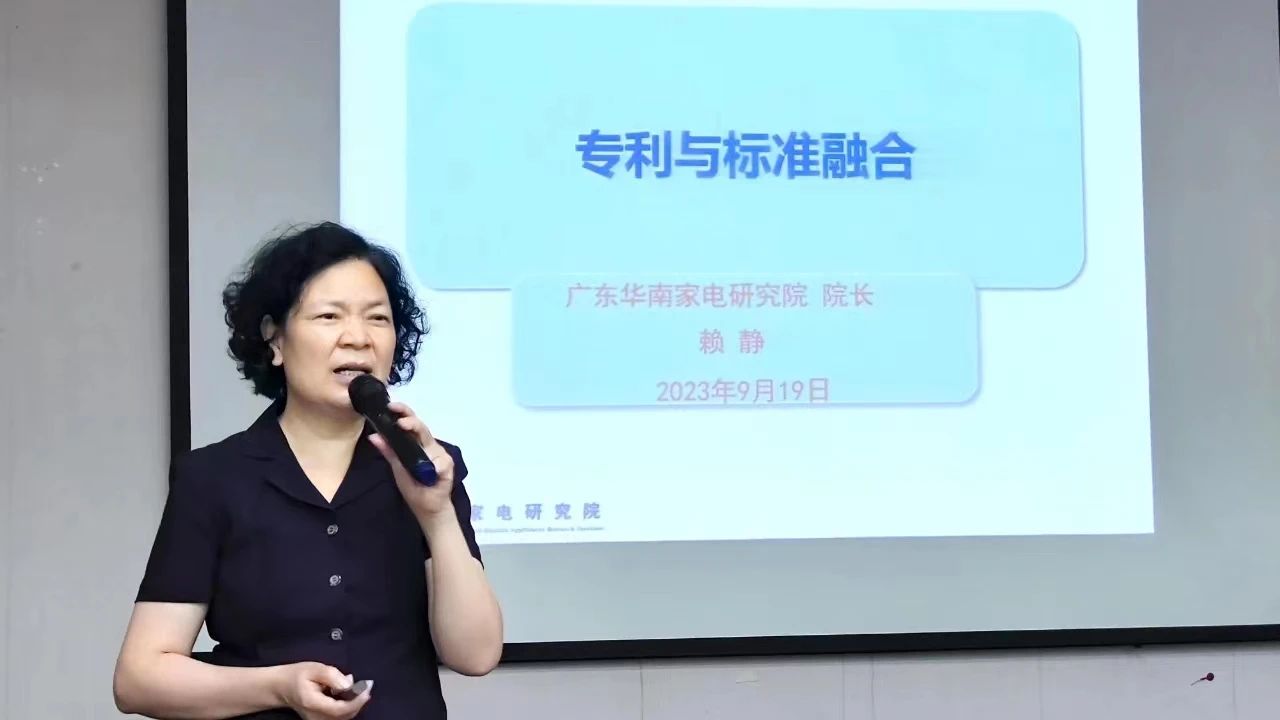 广东华南家电研究院院长、顺德(家电)知识产权快速维权中心主任赖静致辞。她感谢各企业、知识产权机构代表的参与和支持,希望参会人员通过本次学习能提升自身的知识产权保护能力,关注专利与标准的关系,在生产经营活动中有效地规避风险。