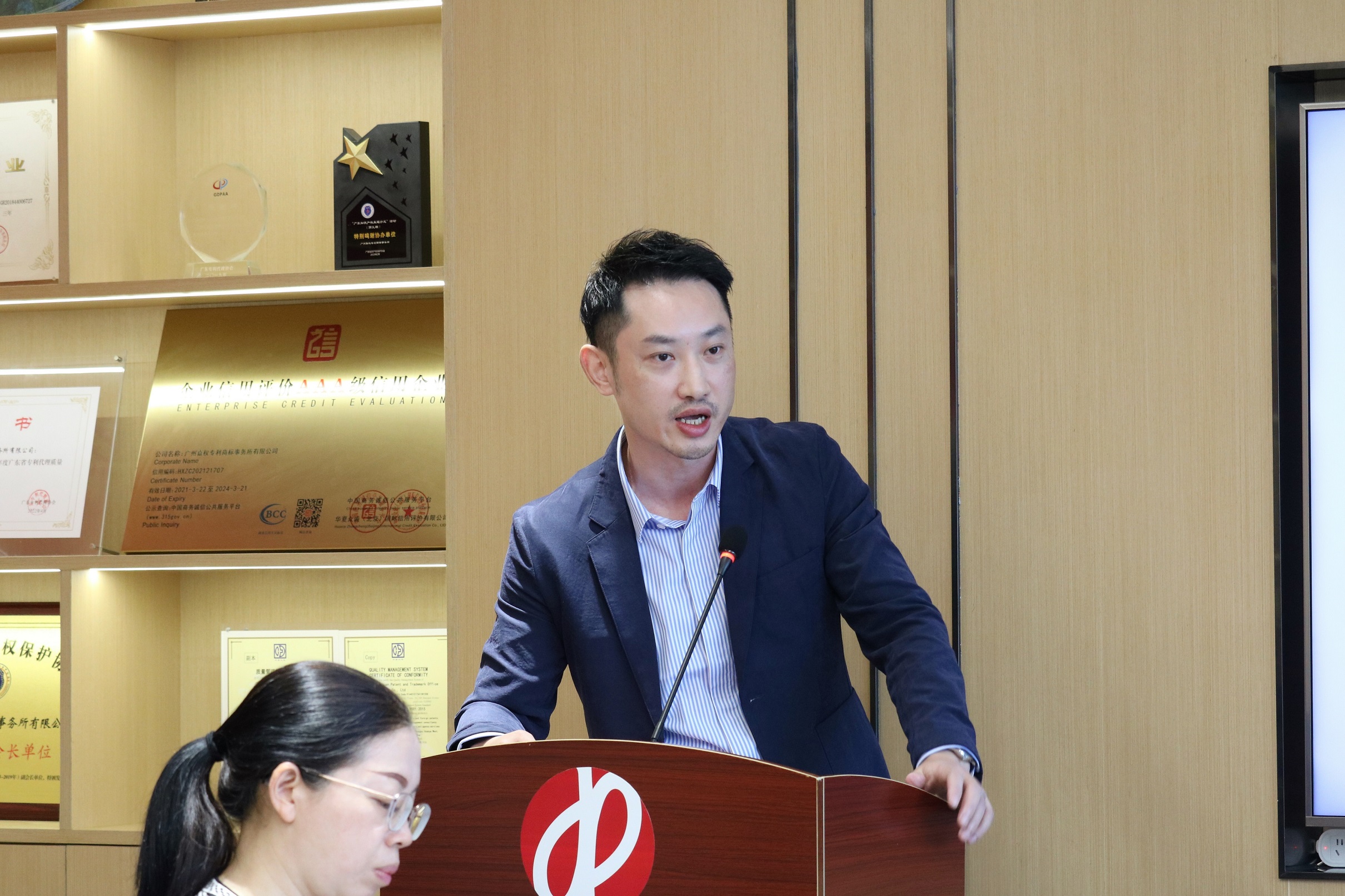 广州嘉权专利商标事务所有限公司副总经理谭英强为沙龙活动致辞。他代表广州嘉权对协会提供的承办机会表示荣幸,并向各参会嘉宾及代表致以热烈的欢迎和诚挚的感谢。随后,他详细介绍了嘉权的发展概况,并对知识产权事业的未来表达了展望。