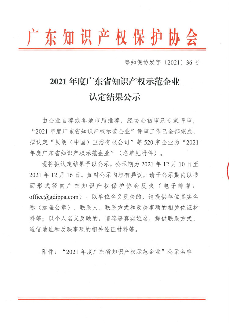 粤知保协发字〔2021〕36号-2021年度广东省知识产权示范企业认定结果公示