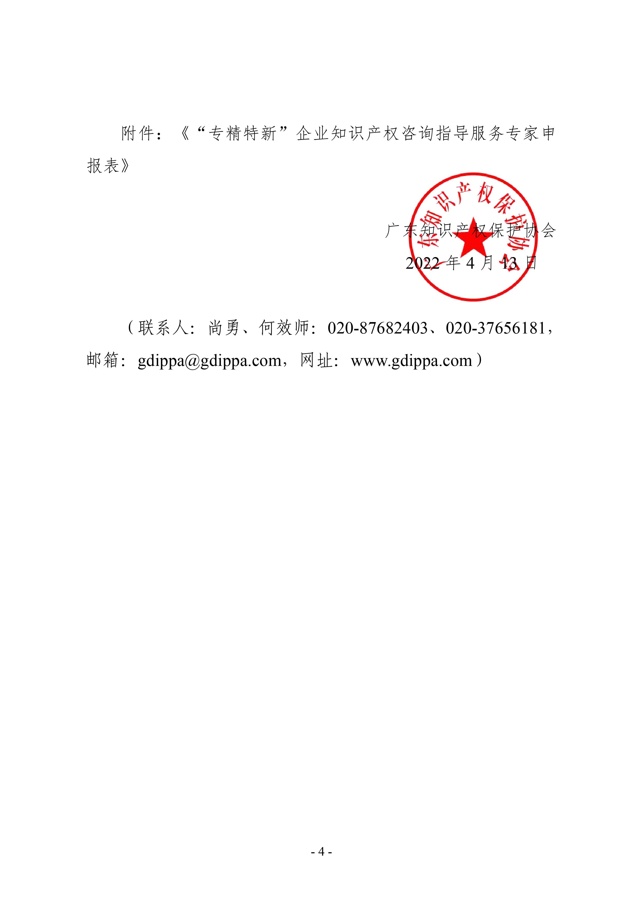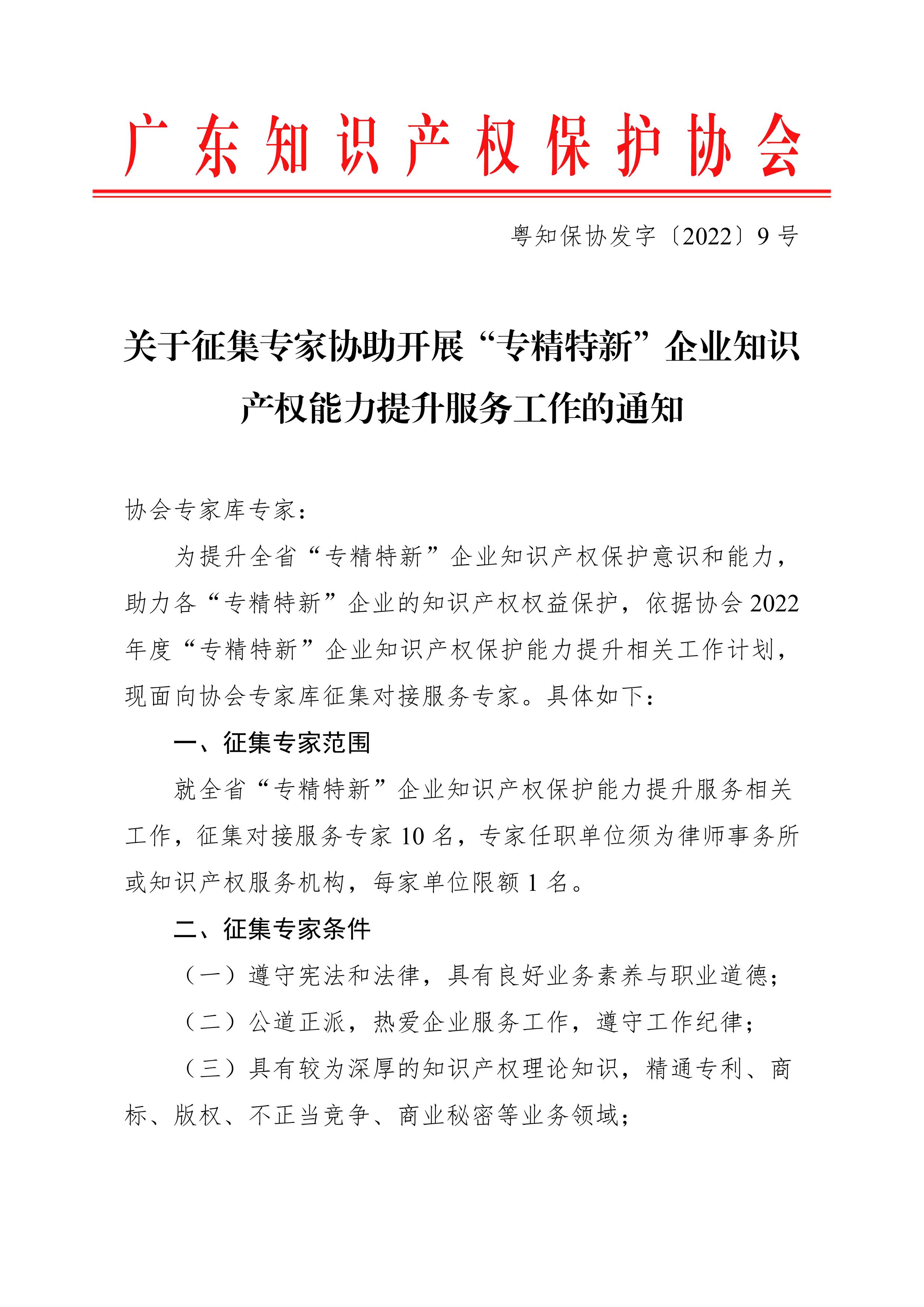 粤知保协发字〔2022〕9号-关于征集专家协助开展“专精特新”企业知识产权能力提升服务工作的通知