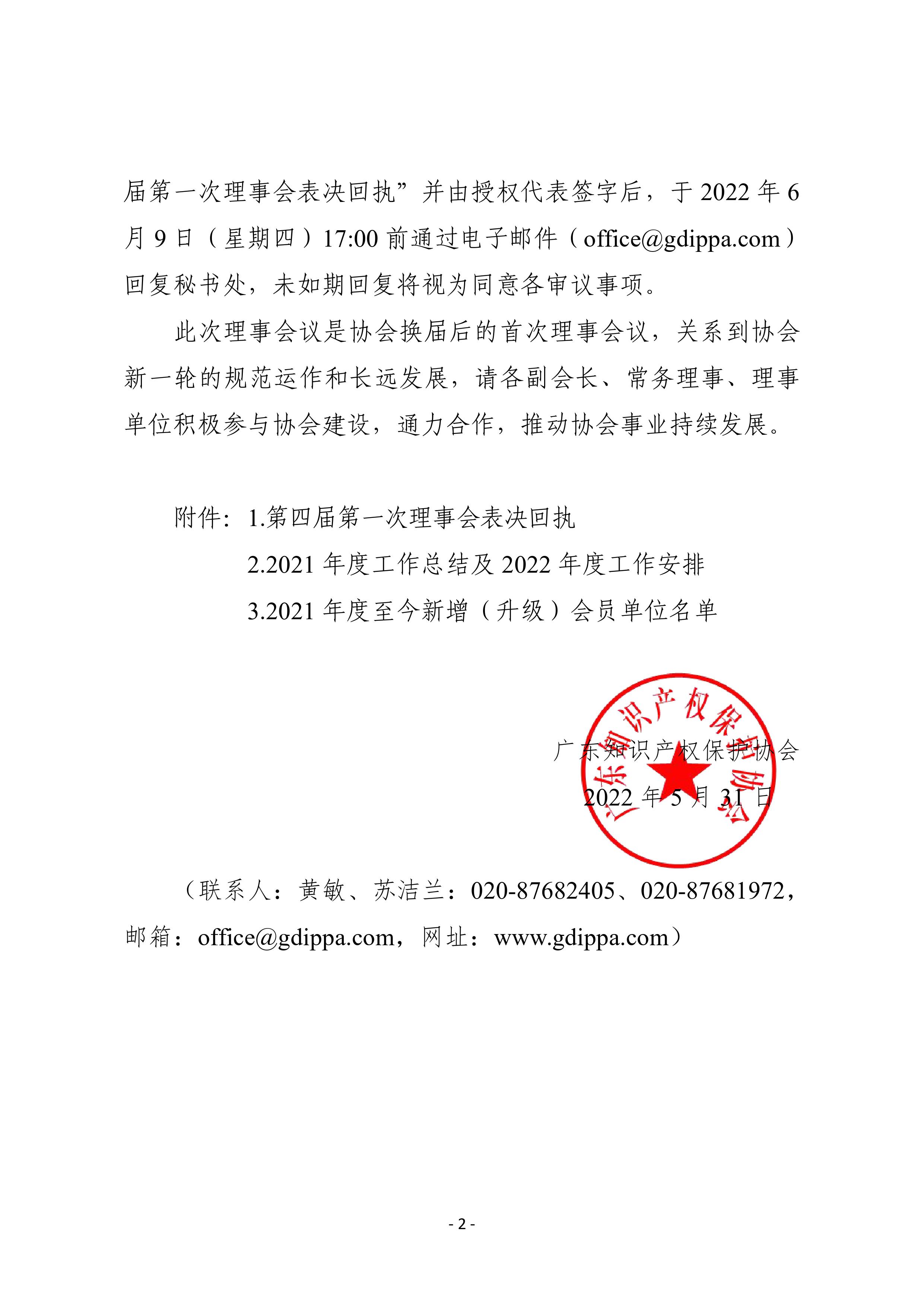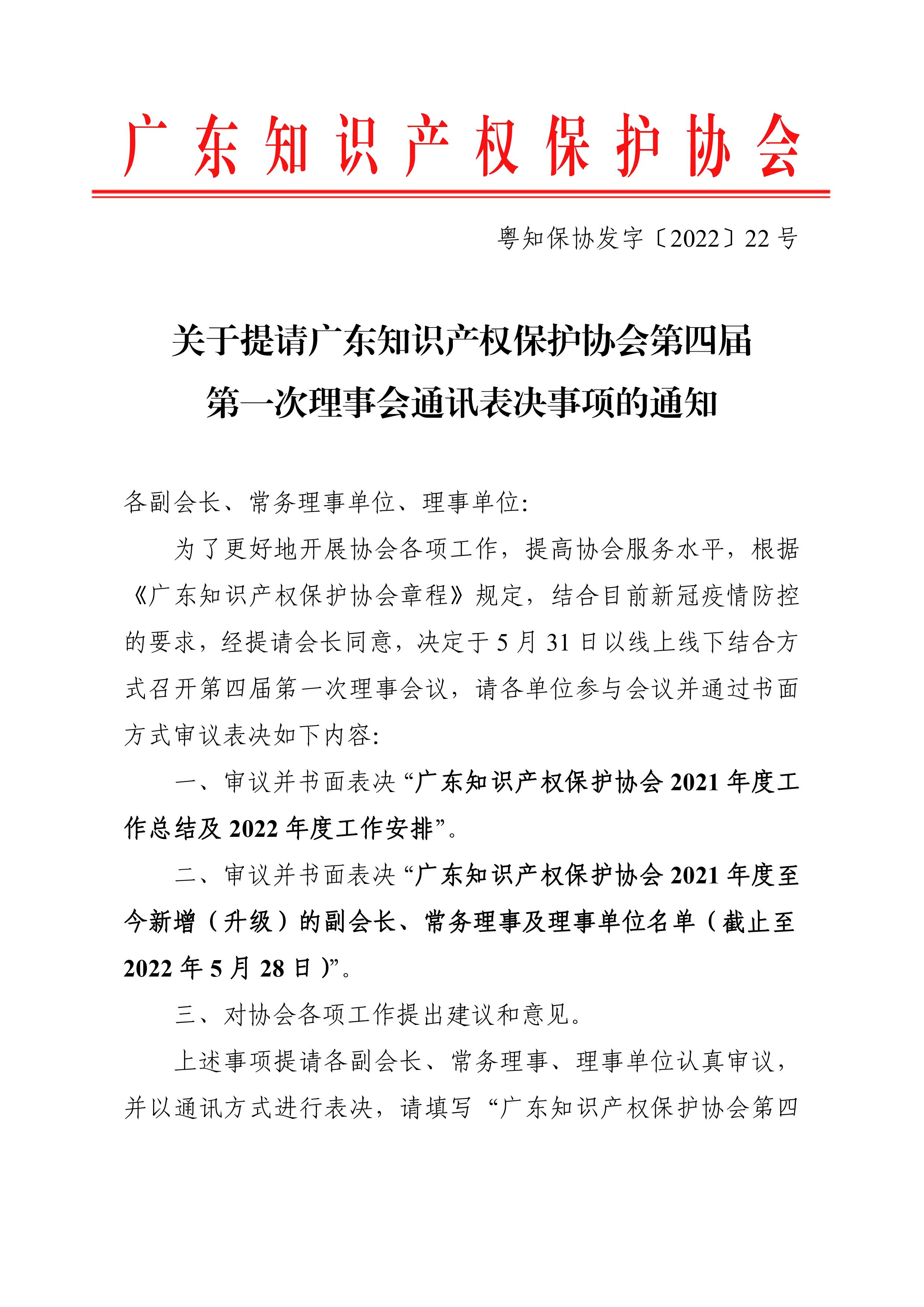 粤知保协发字〔2022〕22号-关于提请广东知识产权保护协会第四届第一次理事会通讯表决事项的通知