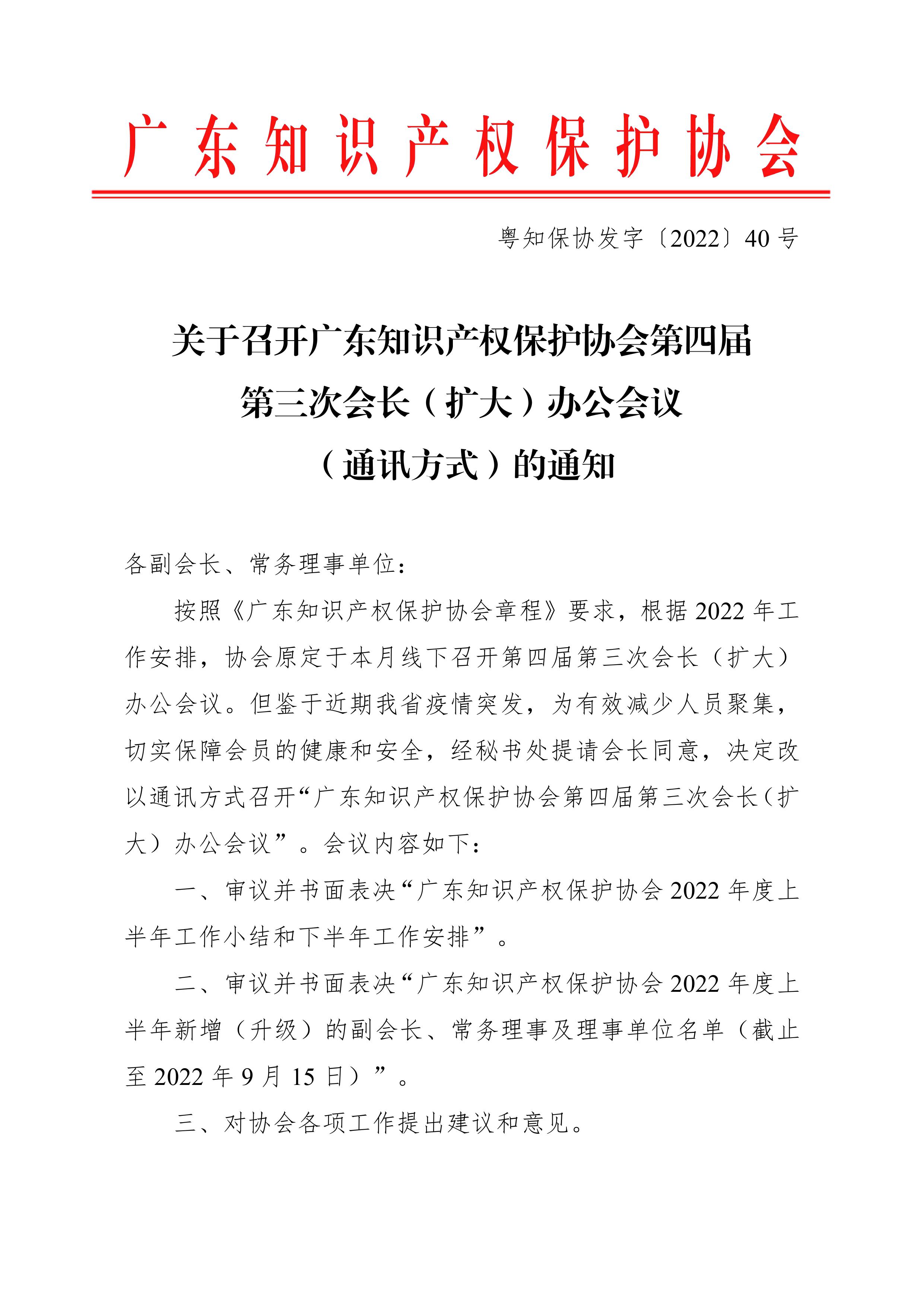 粤知保协发字〔2022〕40号-关于召开广东知识产权保护协会第四届第三次会长(扩大)办公会议(通讯方式)的通知