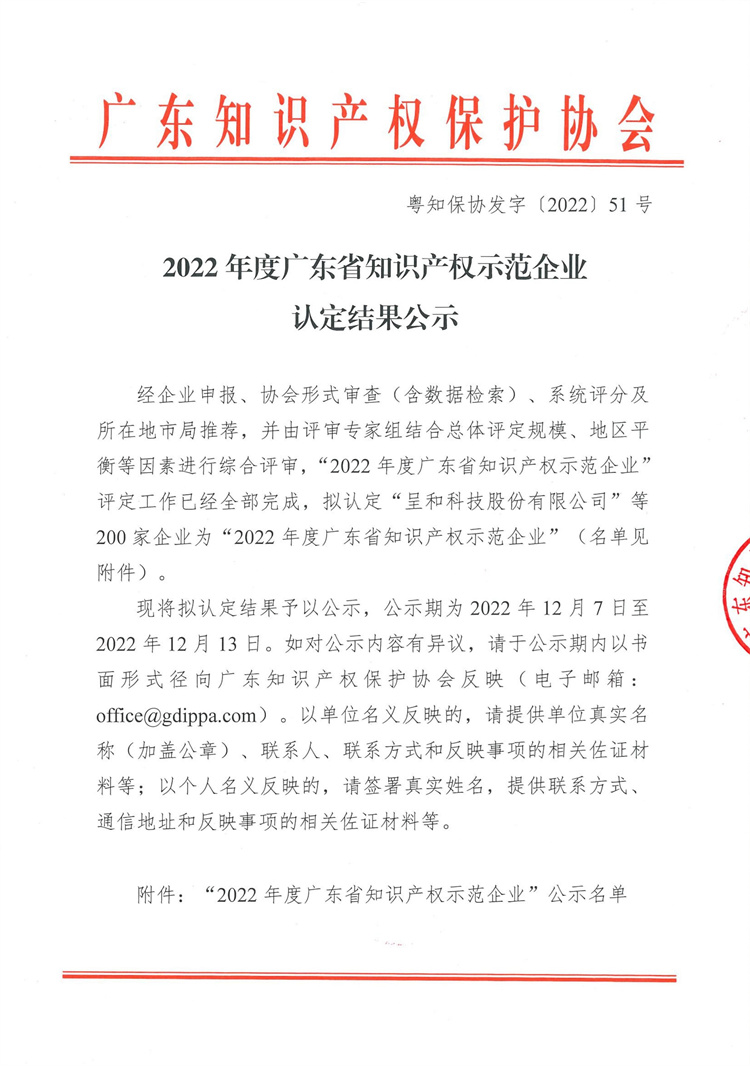 粤知保协发字〔2022〕51号-2022年度广东省知识产权示范企业认定结果公示