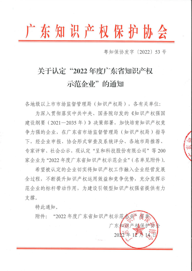 粤知保协发字〔2022〕53号-关于认定“2022年度广东省知识产权示范企业“的通知