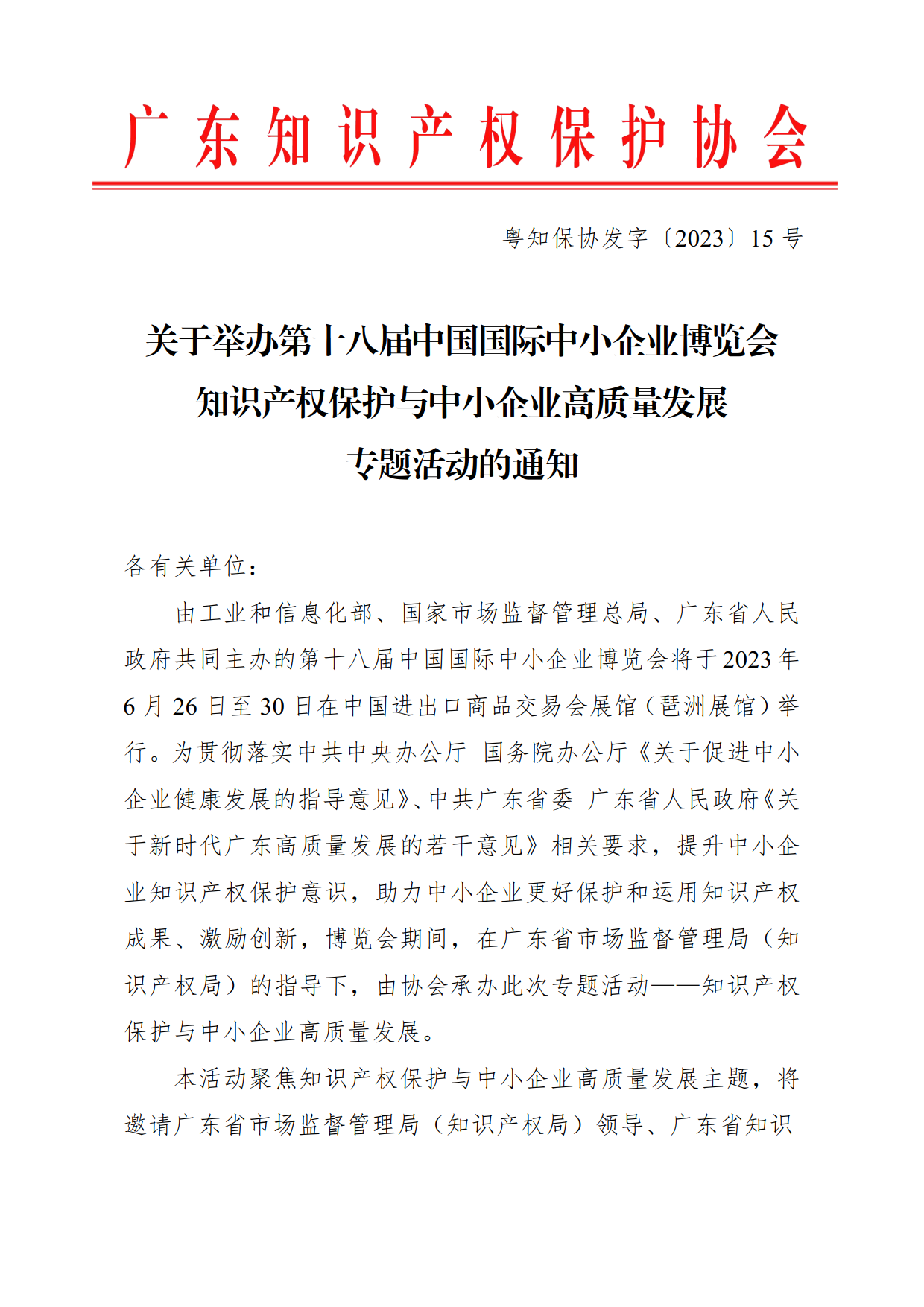 粤知保协发字〔2023〕15号-关于举办第十八届中国国际中小企业博览会知识产权保护与中小企业高质量发展专题活动的通知