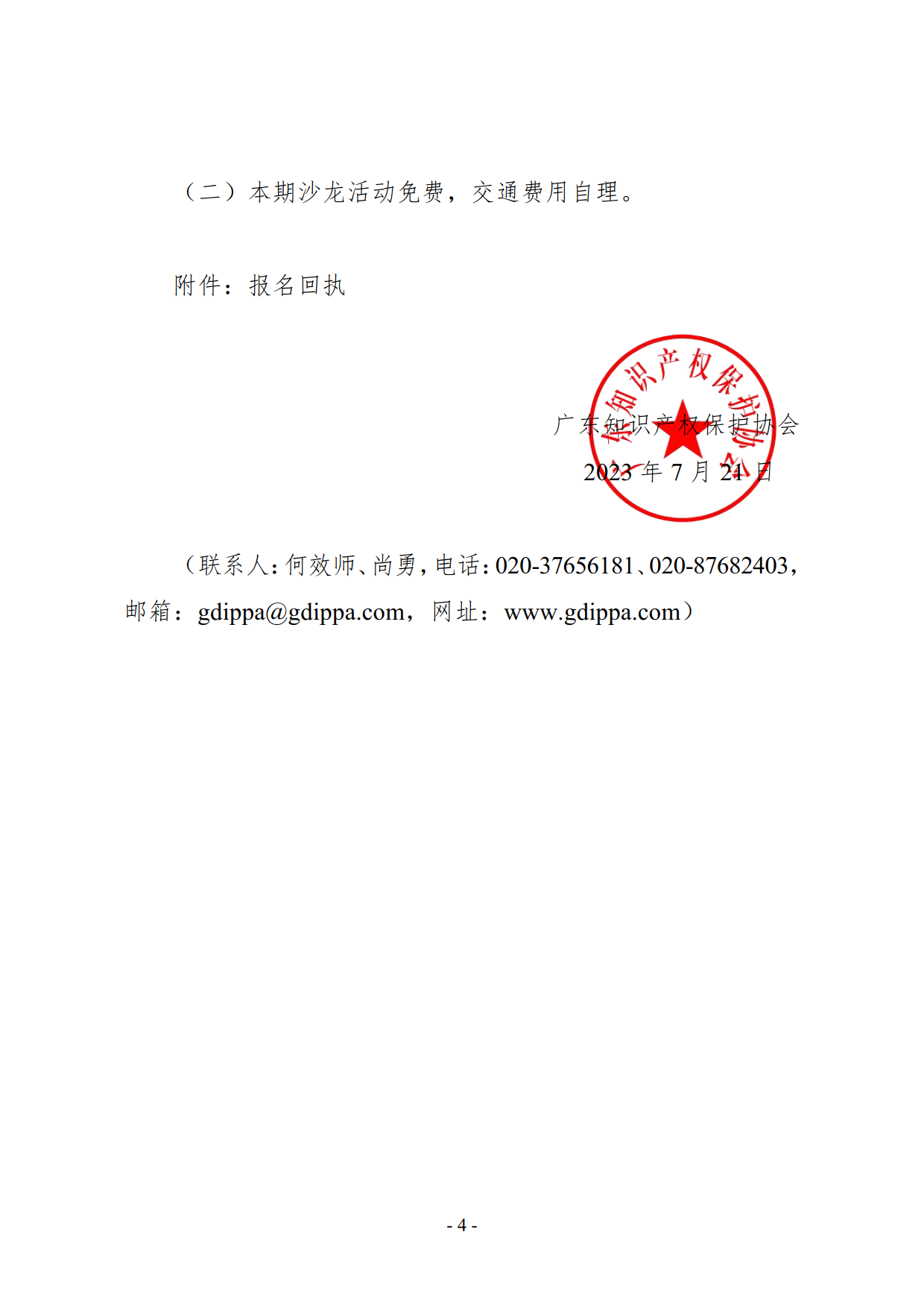 粤知保协发字〔2023〕20号-关于举办第四十六期“广东知识产权主题沙龙——企业专利挖掘、布局及侵权纠纷司法实践”的通知