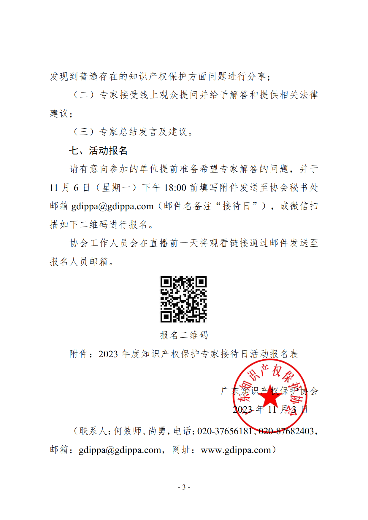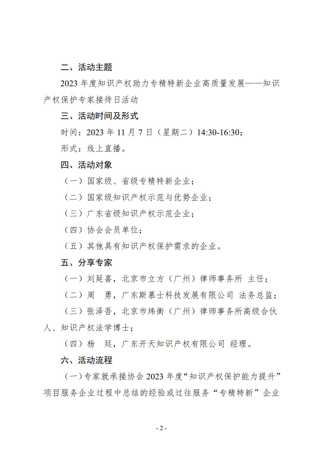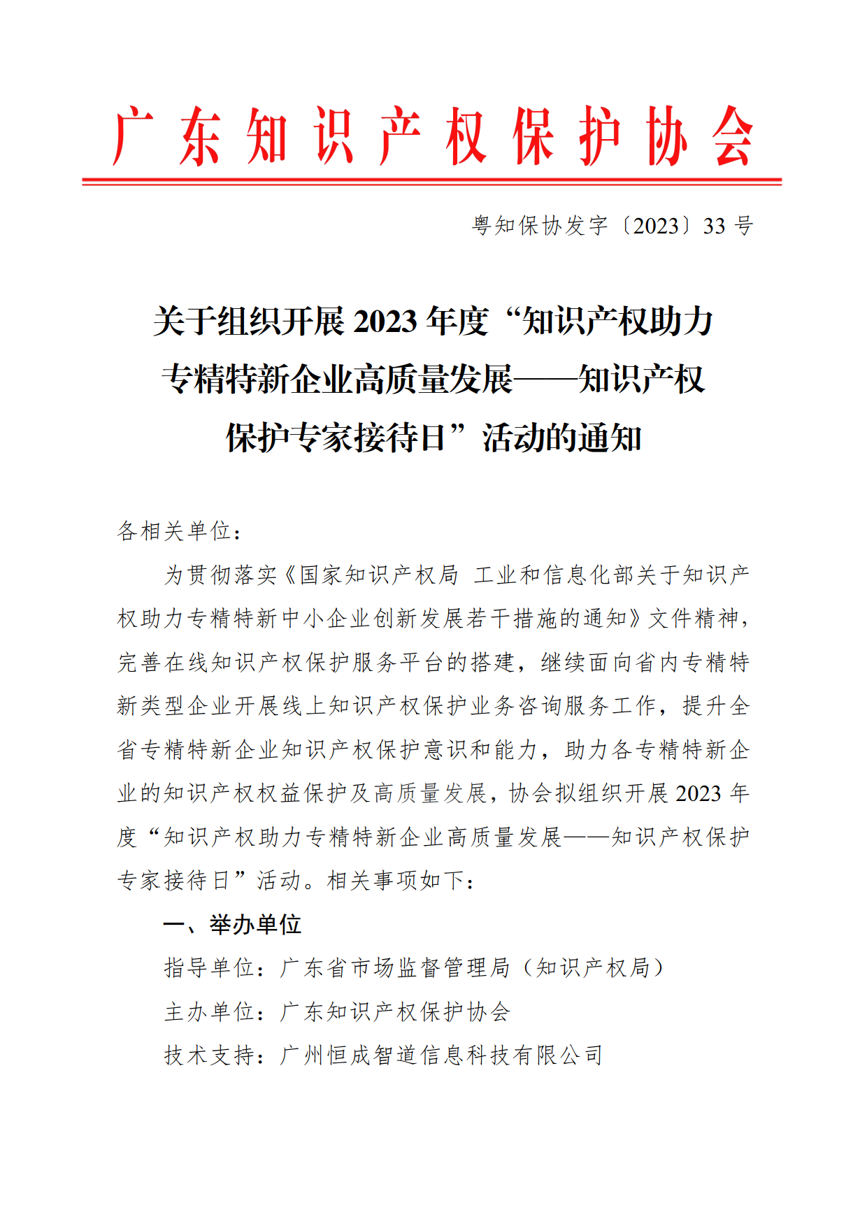 粤知保协发字〔2023〕33号-关于组织开展2023年度”知识产权助力专精特新企业高质量发展——知识产权保护专家接待日”活动的通知