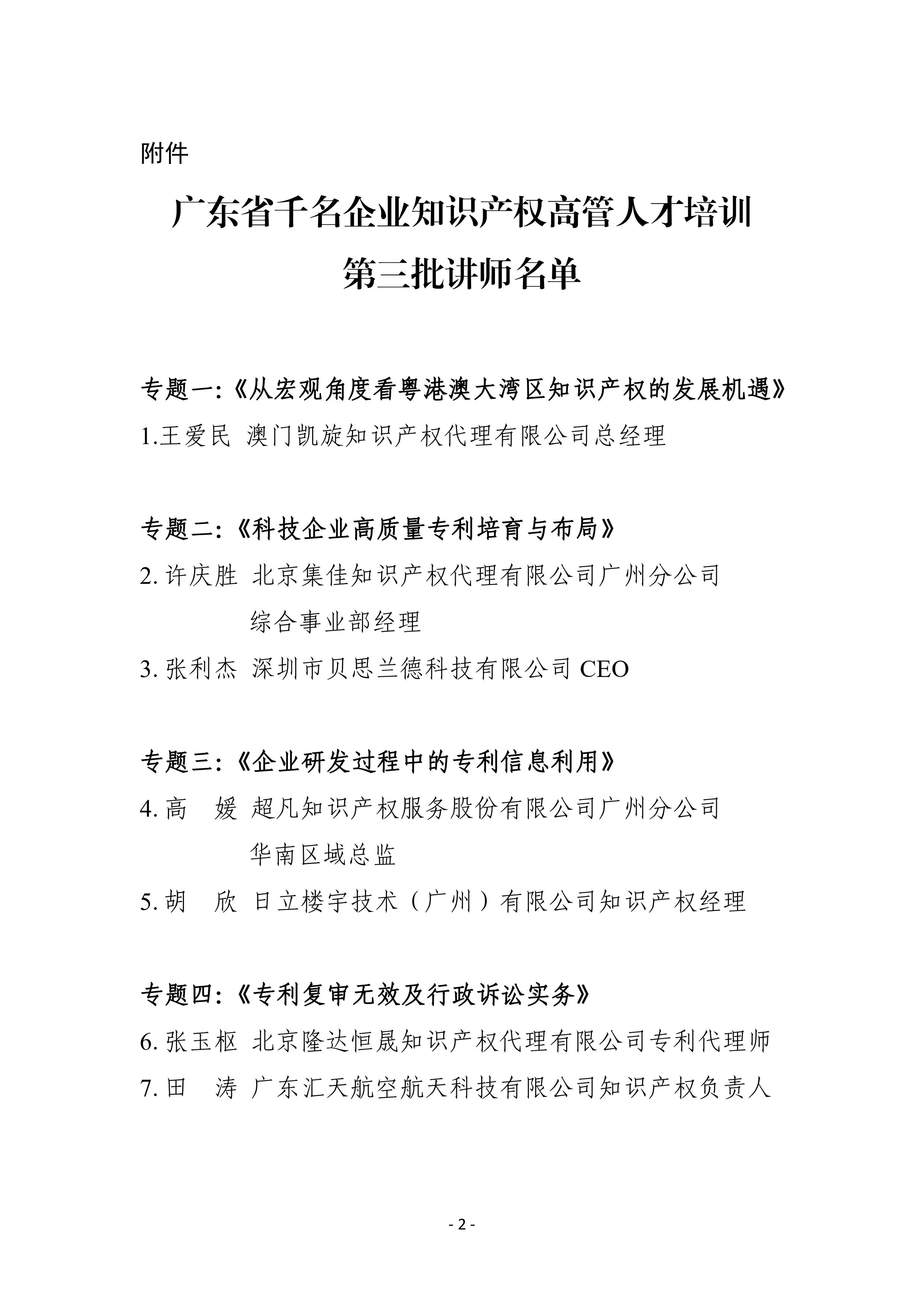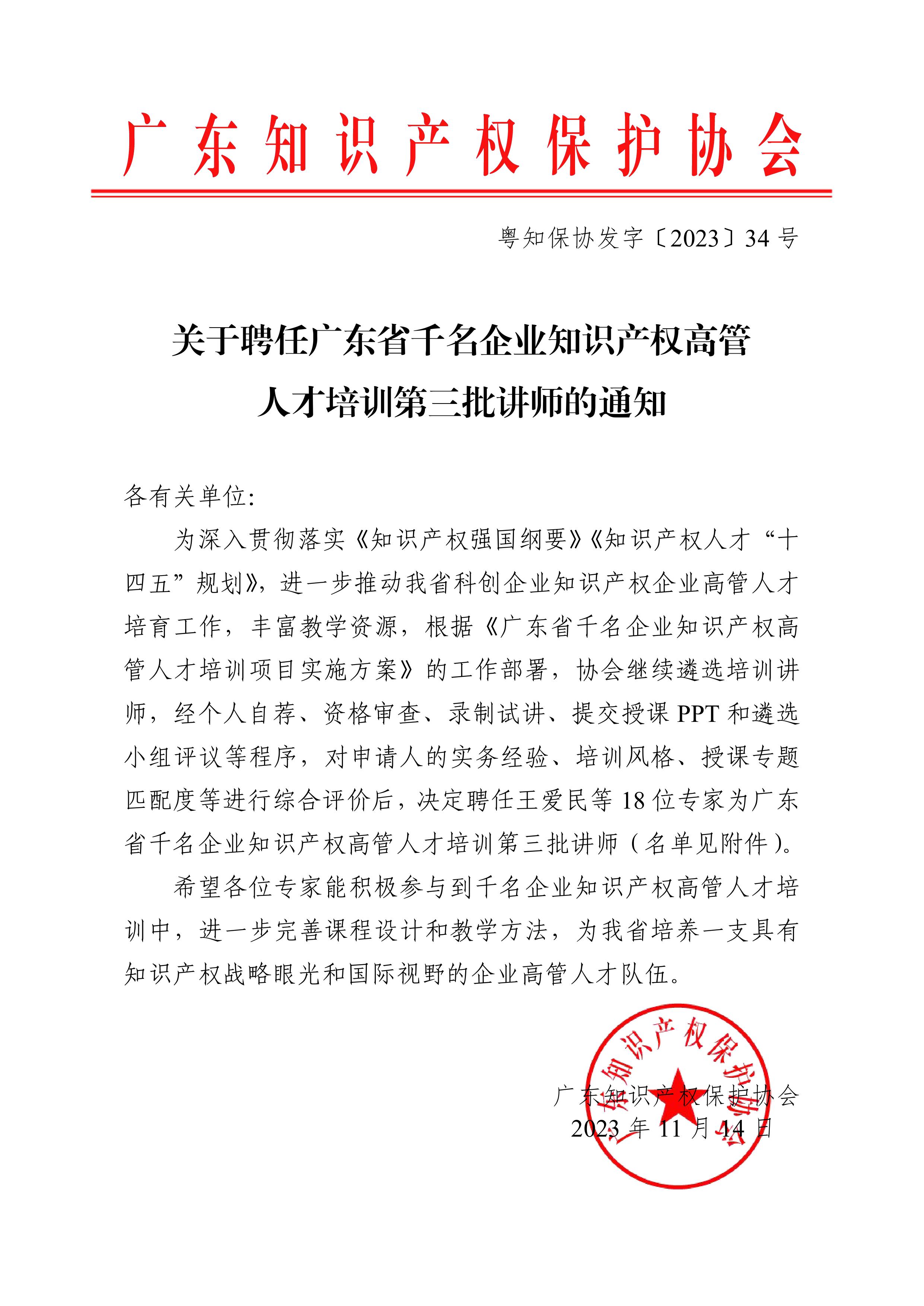 粤知保协发字〔2023〕34号-关于聘任广东省千名企业知识产权高管人才培训第三批讲师的通知