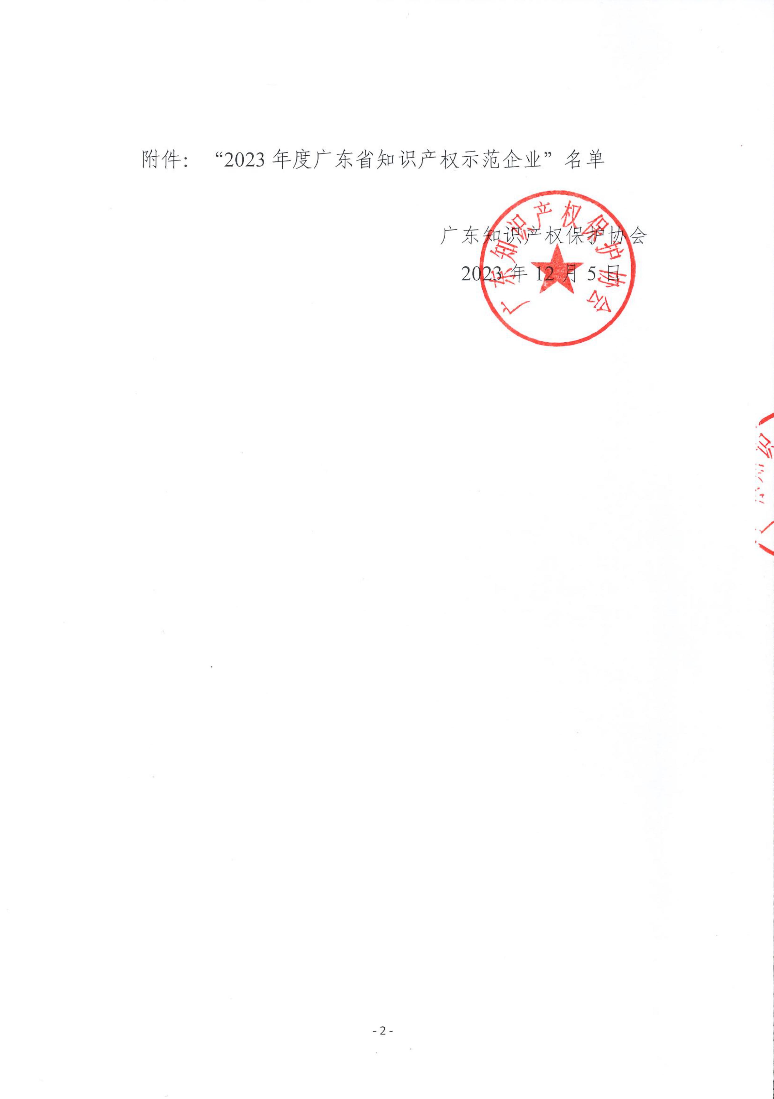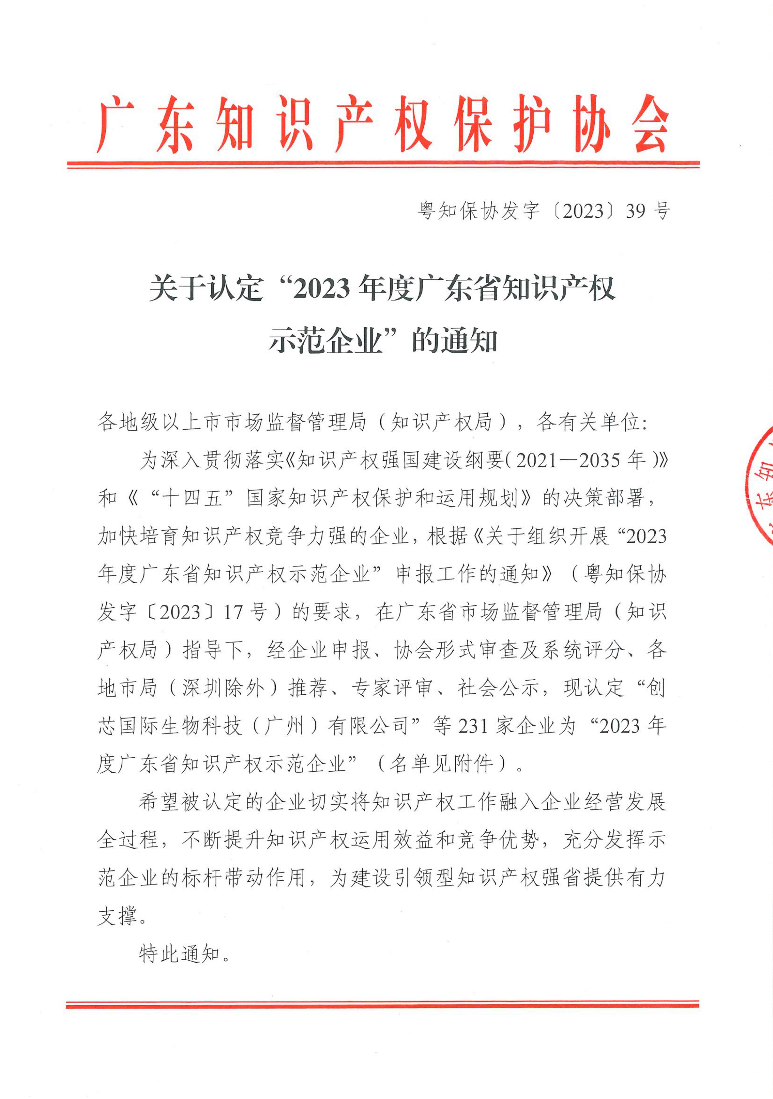 粤知保协发字〔2023〕39号-关于认定“2023年度广东省知识产权示范企业“的通知