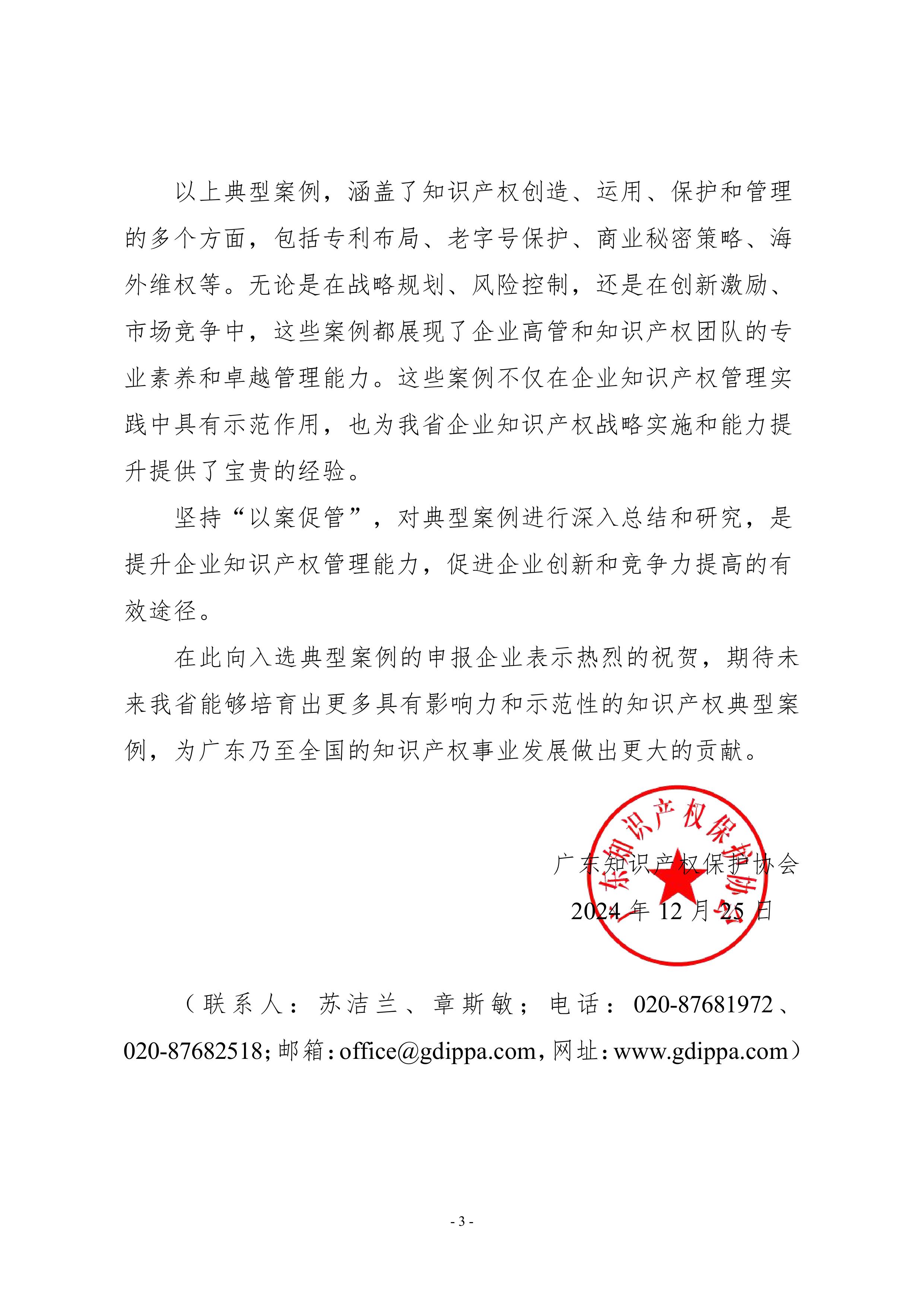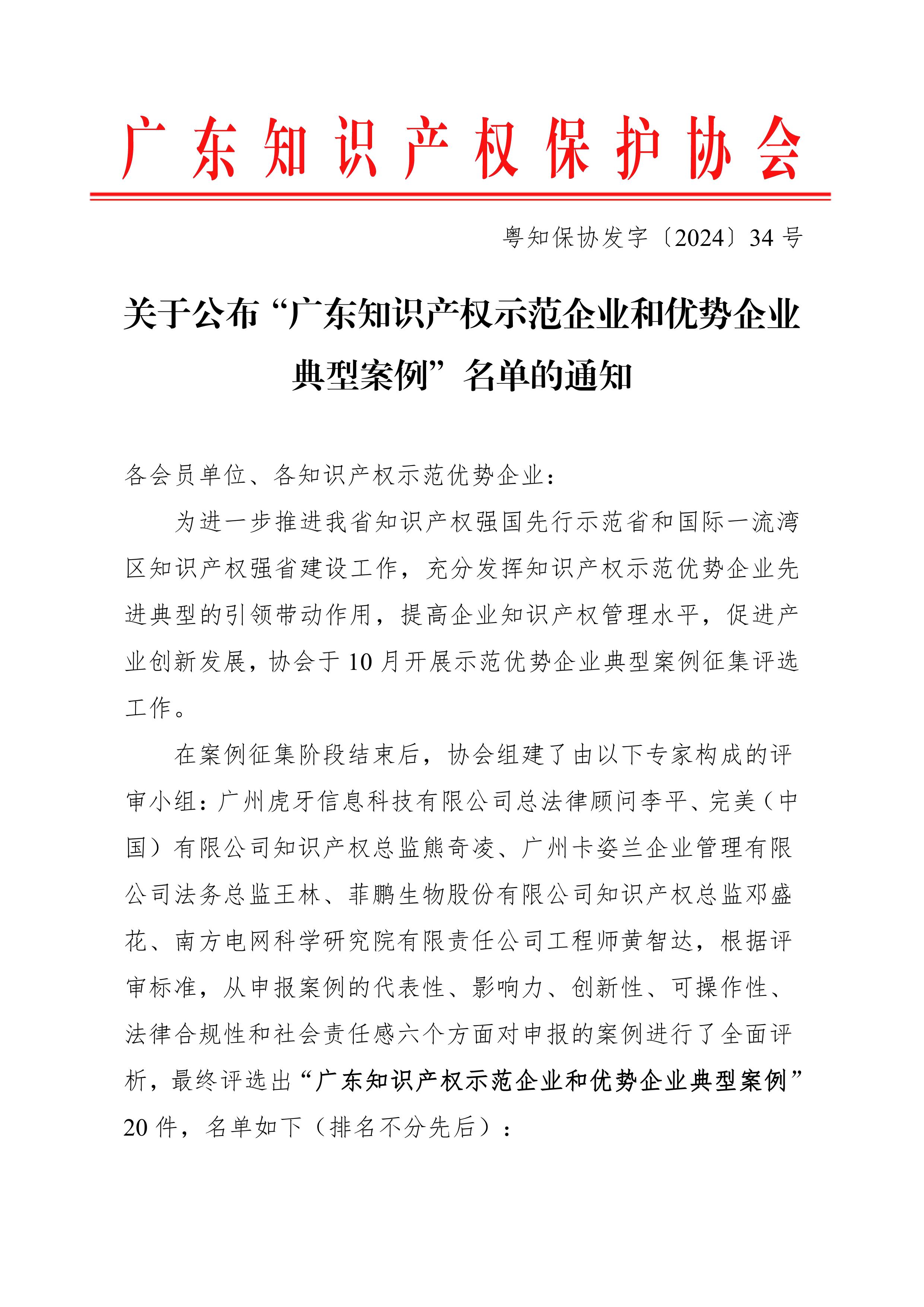 粤知保协发字〔2024〕34号-关于公布“广东知识产权示范企业和优势企业典型案例”的通知