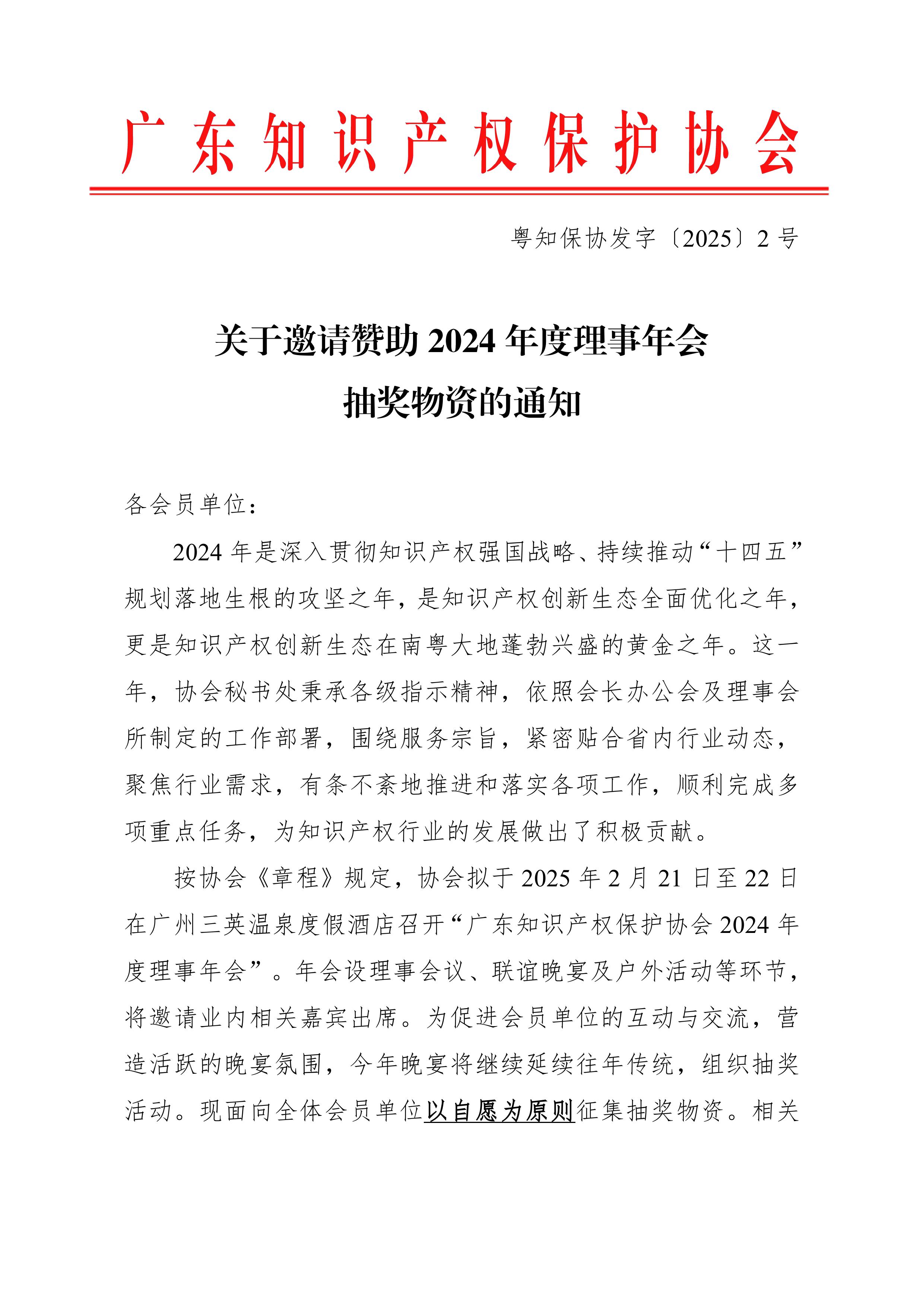 粤知保协发字〔2025〕2号-关于邀请赞助2024年度理事年会抽奖物资的通知