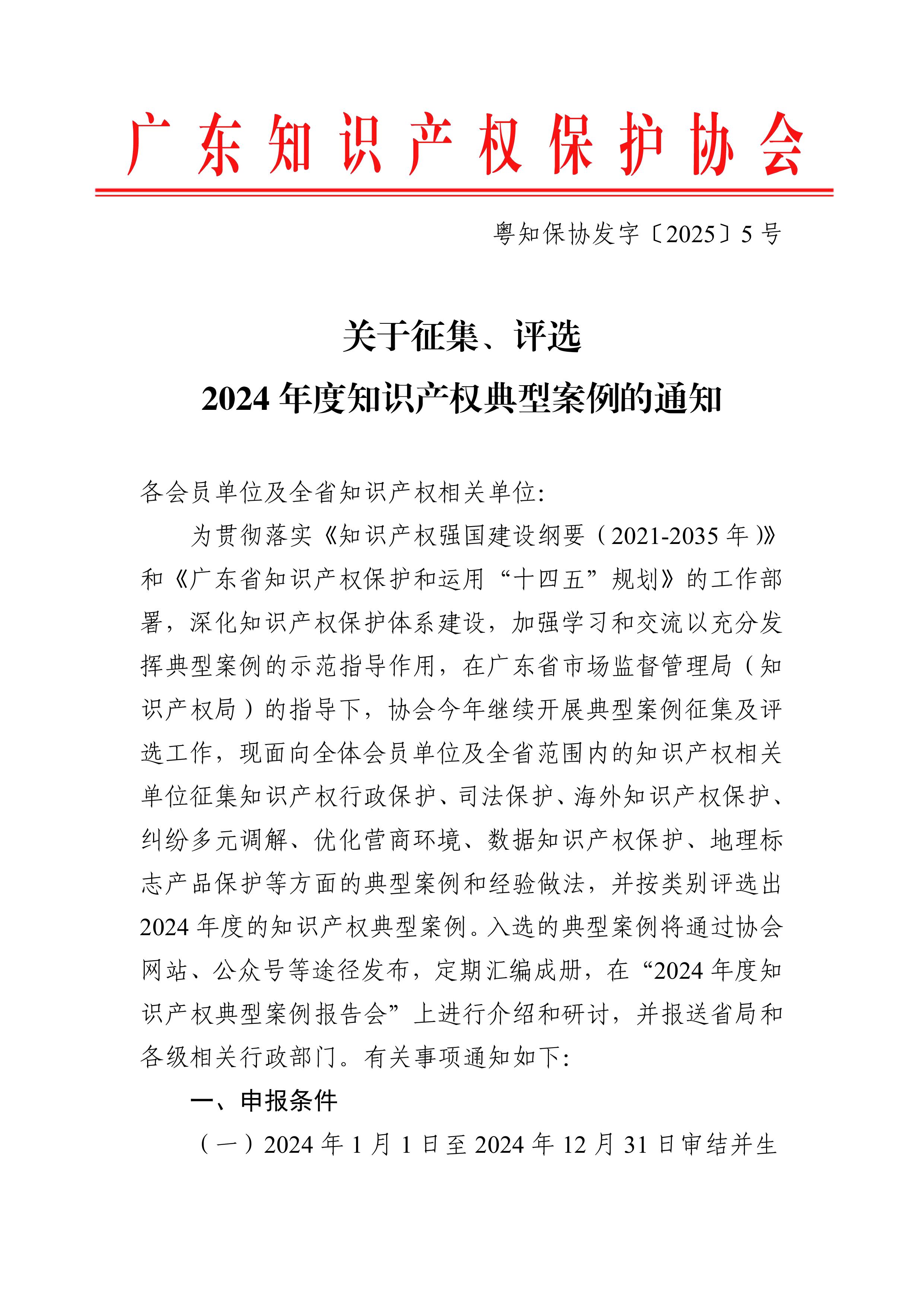粤知保协发字〔2025〕5号-关于征集、评选2024年度知识产权典型案例的通知
