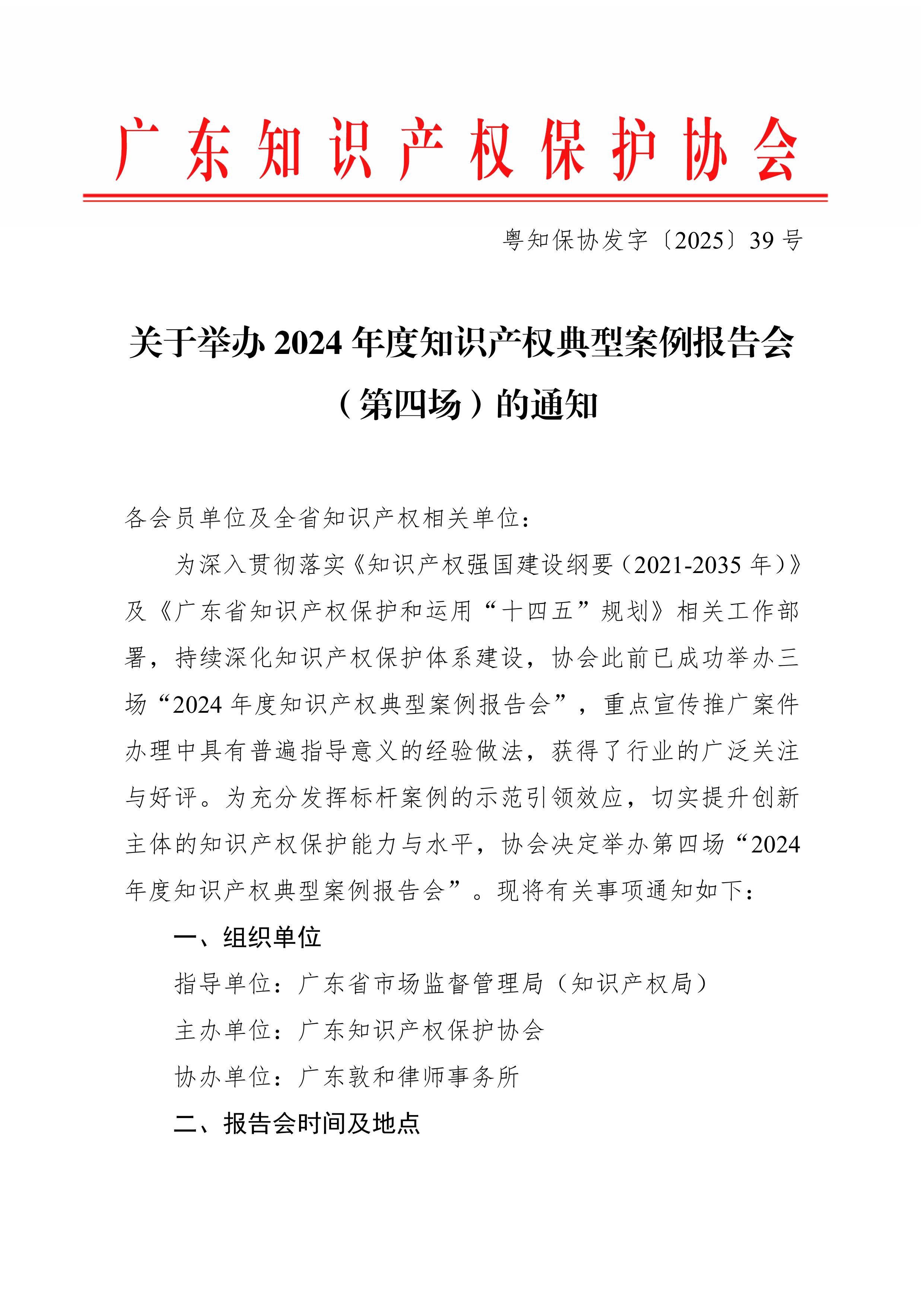 粤知保协发字〔2025〕39号-关于举办2024年度知识产权典型案例报告会(第四场)的通知