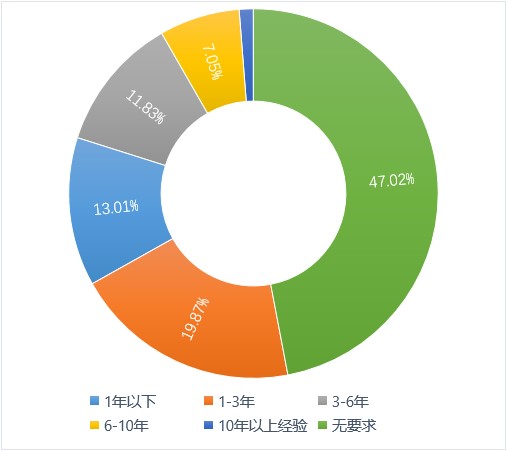 无要求和1-3年经验要求所占比重大,反应了知识产权行业的发展处于上升阶段,企业倾向于自行培养知识产权专业人才,因此对人员经验要求不高。